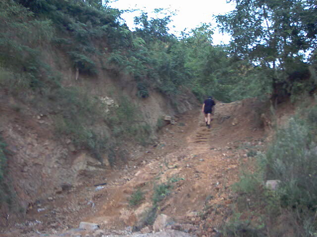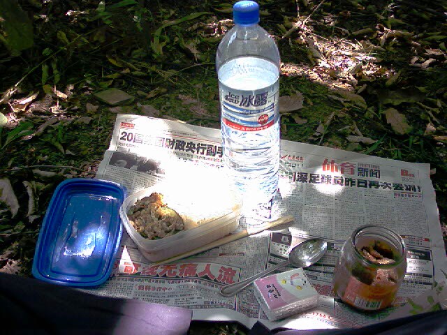 装备:双肩破背包,一双破鞋(就是运动鞋,早晨穿着还行,就是底子薄,如果长时间翻越石头路会搁脚),两大桶水(1500毫升的)——就当负重了,纸巾;带了一套换穿的衣服,早晨登山时,出的汗把整个后背都湿透了,棉线的老头衫,也不爱干,到时好换换,省的贴在后背上难受!另外,还多带了条内裤,我胖乎乎的,走时间长了,汗出多了,摩腿(大腿啊),不舒服!对了,还有饭,晚上回来,打开冰箱,看看只有三根黄瓜和鸡蛋了,来个黄瓜炒鸡蛋,再炸个肉酱(打开我妈给我带来的酱一看,哇,咋有活物了呢?上周还炸酱来着呢,只好扔掉,郁闷!),酱还是炸了,用的是葱伴侣豆瓣酱,一点都不好吃!明天不带了,太咸了,怕费水!留着这两天吃面条当卤了!再找找,还有个鱼罐头,带着。还有银子,老婆就给我留下20块人民币,让我过三天,我还保证呢,绝对没问题!带上!这可是现金啊!要是有人抢我,一点不给,也不太仁义啊!