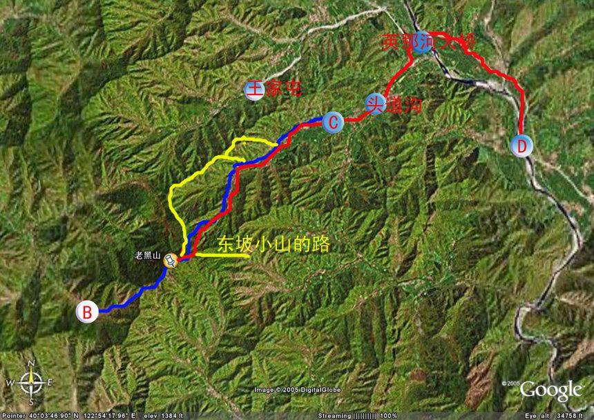 图中绿线为第一天从南坡到西坡露营地的穿越路线。A点是小峪,B点是露营地