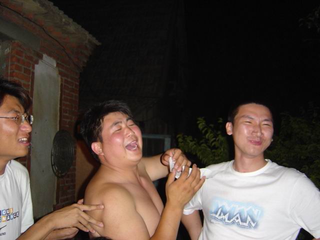 那晚,在胖六家腐败。胖六想出了个馊点子,大家彼此写下惩罚性的游戏内容,然后抽签。 也不知道谁那么恶毒,要求吃下一个饼子,不幸被俺抽中还好,当时的土豆舍身相救,俺换成了他的讲讲出连故事,哈哈。那时候大家都以拍饭票为乐,看看背景中ZY的淫笑吧。 hV1vHzIX.jpg 真是恶有恶报啊,看ZY的钢管舞~~~ 3rKlRKgo.jpg 胖刘总是那么幸运的抽中和GG亲密接触