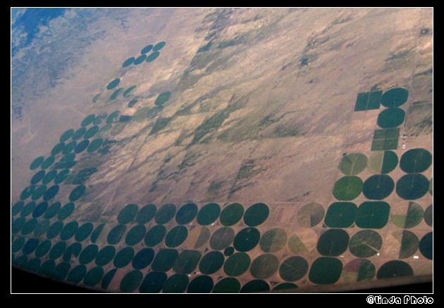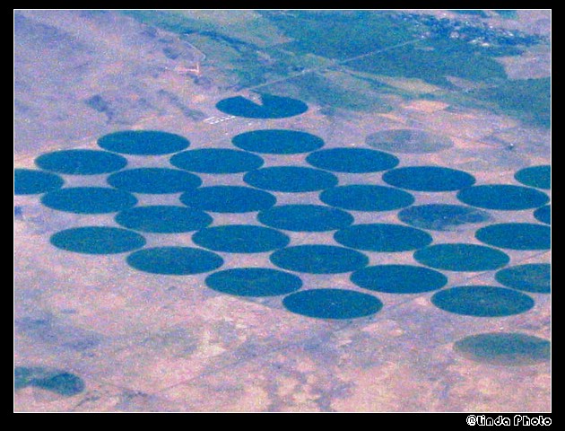 以前看过一套片子。介绍的情况就是这样。实际上就是中间的圆圈是农作物。方块中的边角是绿色植物。土地是轮作的。收割也是转圈收割。据说是设备投资最少。相对于我们来说他们的土地资源非常丰富。在地面附近拍摄的效果也是很惊人的。马上能改变对农业的认识。知道农业工业化的面貌。哎,不说了。农民真穷,农村真苦,农业真危险这句话应该配上这样的pp。