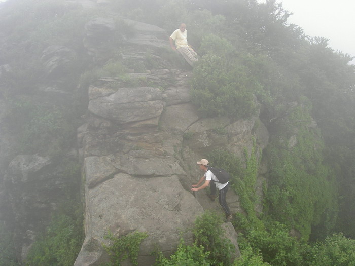 参加人员:美奂,天意,雪花飘,三疯,铃铛,英雄喝多也吐,旱收,巧克力、南茜,impink,忆秋贤人、顺心、小顺心、冰河、组织者:福气、静石。 行程安排:按计划在沃尔玛广场乘8:40 准时出发,走沈大高速在三十里堡下道,向石河方向走,在石河镇内向右拐,经过一个小水库到达东沟村。时间大约1个小时。 9:40顺着一个正在修的进山水泥路面,正南面,向山里进发,在山脚下,有一块已经开出了类似停车场的空地。小黑山也要进行旅游开发? 顺着山路继续前进,开始的时候还比较的宽,类似于农村的土路,宽度能走开马车。一直可以走到一处山脊上,山脊上有小路可以一直走到山顶。山上的植被很好,风景也很不错,只可惜,雾大看不清远处。途中有几处悬崖,比较刺激,需要大家协力通过。特别是主峰的悬崖,上去很难,幸亏福气带了绳子,让大部分人登顶成功。这个山主峰很有特点,必须攀岩而上,之前的多好团队都是部分胆大勇气者上去,我们这次也没例外,不过有绳子的帮助,大部分都上去了,只可惜的是,山顶浓雾迷漫,看不清什么。值得一提的是,主峰的山崖中间,修了一座小庙,香火很好,我们进去的时候,香烟正浓,山顶上遇到的5,6个人刚上来过进过香。山上的风很大。雾很浓,没多停留。12:00开始从南面下山,半途中找了一块开阔地,我们开始了午餐,有两个炉头,大家被美奂的汤面吸引,杀人没玩成,几个人打了会儿扑克。午休时间90分钟左右,14:00开始向着山下公路上的面包车方向前进。途中看见更好的开阔地。象草原,象牧场,是露营的好地方。而且居然还有休闲凳。14:30分到达山下的李家屯的公路,公路的名字是土四线。 天气很照顾,没有下雨,也没有太阳,是这个季节爬山难得的好天气。唯一的遗憾是山顶雾大,没有看清小黑山的真实面目。 众驴感觉比大黑山好玩。另外,山的南面和北面都有水库。