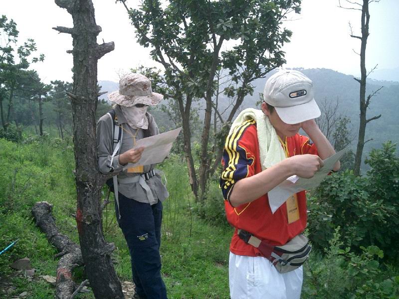没有磨合,比赛就这么开始了。尽管酷暑难当,可是我们还是尽可能的争分夺秒。点位都不是很难找,可是我们却难以避免失误……在首点我们稍稍走过一点之后,还是没有吸取教训,精力充沛的走过了第二点18点。还好拉拉队员13的一个电话,让我们及时纠正了行路方向,并且很快地找到了18点。再做了战略分析之后,我们分作两队找点。考虑到我的体力问题,由我和叶绿素找相对较近的一侧点;而老赵大锅和候鸟找68点那边路途远些的点。