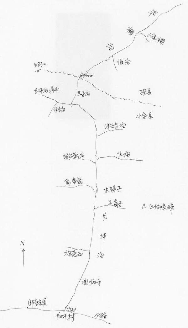 近11:00am,我们赶到了两河口。远远望见西北方一座山形奇特的雪峰,整个山体坡度在七八十度之间,愈近山顶,坡度愈大,到得后来,干脆就成了针尖一般。这就是被当地人视为神山的婆缪山,平日也叫“尖子峰”,和眼前所见倒也异常贴切。四姑娘山地区山峰的地表主要为中生代和古生代的砂岩、板岩、大理石、石灰岩与结晶灰岩组成。这些岩石大多耐风化剥蚀,山峰尖削陡峭,直插云天。除了四座被称为“四姑娘”的雪峰外,其周围还分布着二十多座被冰雪覆盖着的四五千米级的山峰,我们计划中将要翻越的叉子沟雪山垭口就是其中之一。