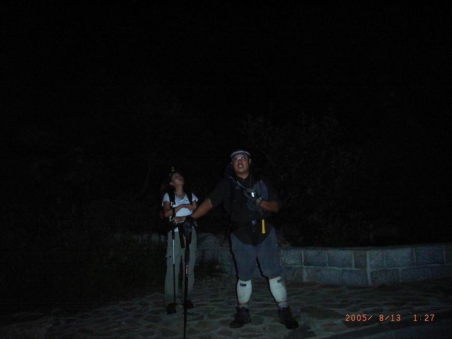 1951我们到达大连大学,没吃晚饭的NICOLE坚持不吃也可以成行。OK。2011我们到达观音阁大门口,右转上山,1小时后我们到达山脊,用上次定向比赛的奖品手电,我们开始了向主峰的进发。心中带着对流星雨的盼望。微弱的照明,险峻的山路,兴奋的心情,稳健的脚步,沉重的背包。2230,NICOLE饿了,几乎是就地休息打尖,我和叶绿素吸支烟等待小N。23点多一些,我们发现我们没有走预计的路线上,我们多走了一个山坳,除非回头,否则不能从信号塔处的柏油路下到点将台-我们计划中看流星雨的地方。试探性的横切被大家一致判断为不可行,决定跟着清晰的小路下山,预计出口在点将台-朝阳寺之间的公路上,缓慢的下降,伴随着NICOLE激动人心的尖叫(我的心乱跳,以为遇到了蛇,实际上是蛾)我们下到盼望中的公路上,叶绿素-我们的开路先锋辛苦了。一次LOSE WAY,竟然走了一条信号塔下到点将台的土路,也算意外收获。