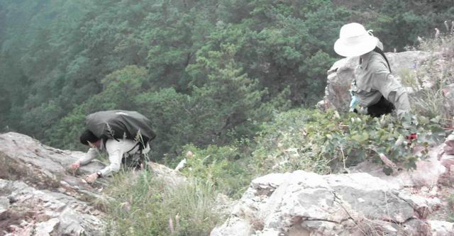 果然情况正如我所料,见到林硒和林硒+1是二位PLMM,心中窃喜,以为总算有比我体力弱的驴友同行,可谁知8点出发从双台沟开始上山后,二位MM一马当先走在了队伍的前列,一路强行军来到了城山,按照bear的节奏,我们爬45分钟的山休息5分钟,这种强度我完全适应不了,二个小时后,我已经大汗淋漓,几乎虚脱,期间要经过一段悬崖,需要攀岩下行,以后穿越的驴友们要特别注意安全。11点我们到达城山的主峰,这时bear护送二位MM从主峰顺金龙寺森林公园的台阶按计划下撤,文哥、叶绿素和我继续前行,在穿越过N道山峰后,12点我们从城山山脉下撤到一个小村庄进行半小时的休整午餐并补充水源。之后我们一行三人继续向鞍子山进发。在穿过了几道山脉后,我的左腿隐隐作痛,体力也有些透支,不巧的是我的登山鞋也不适时宜地脱帮掉底,叶绿素晚上也有事要办,经过大家商议,决定从岔鞍子下撤,下午3:30分下撤到南岔村结束了本次穿越活动。