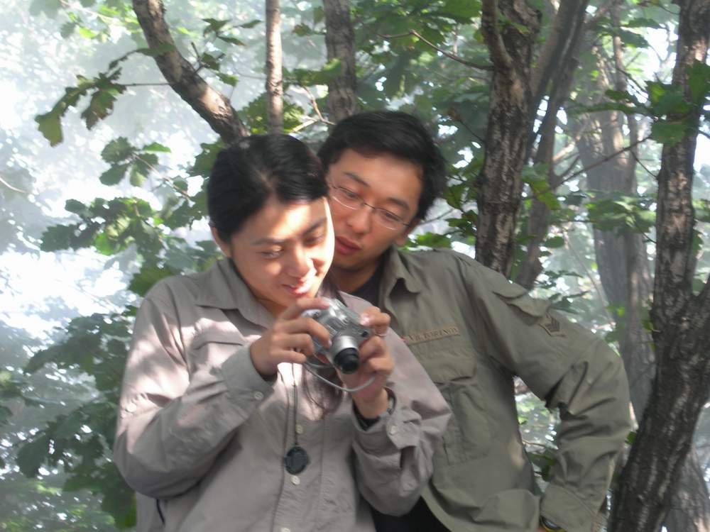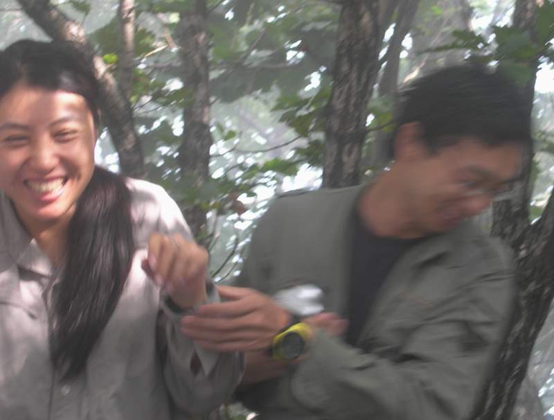 接下来是长长的山路,不停的上升,偶尔的小憩,成就了数不清的饭票。东子成了最可怜的摄影师,每次他把相机举起,总会有人大叫“不要拍我!”恐怖指数二级。可能是我们几位MM上升速度太慢,担任收队的老九,承受不了长时间压抑的感觉,另辟蹊径,从后队变成了前队,看到我们在树丛里艰难的前进,老九居高临下,指点我们向“无路山脊”方向走去。身边的草是会“bo”人的,还好我基本上是全副武装,而nicole的胳膊深受喜爱,被小草们签了不少名。和老九会合了,路更加陡峭起来,老九采用藐视法激励大家“还有100米了,也就是爬楼梯爬三个来回”!只是没有想到,这楼梯极有个性,植被极其丰富,小树们偷偷的伸手拉扯着我们的衣服和背包,或者悄悄的在我们的脚下下个绊子,有几级台阶过高了,用攀岩的方式爬楼梯,在我还是第一次。