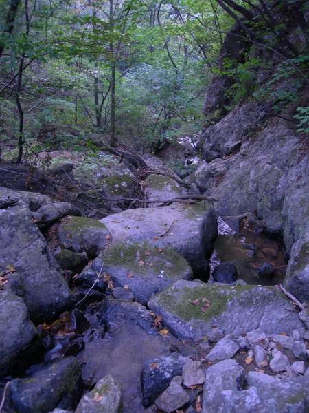 16:10,山势终于变缓,(图中R点)只不过,因为谷地的局促,除了完全由石头搭成的水道外,两侧都是极密的灌木。我们并没有找到昨天下山路段那样的溪边小路。石头水道的行进速度当然没有办法跟土路相比。