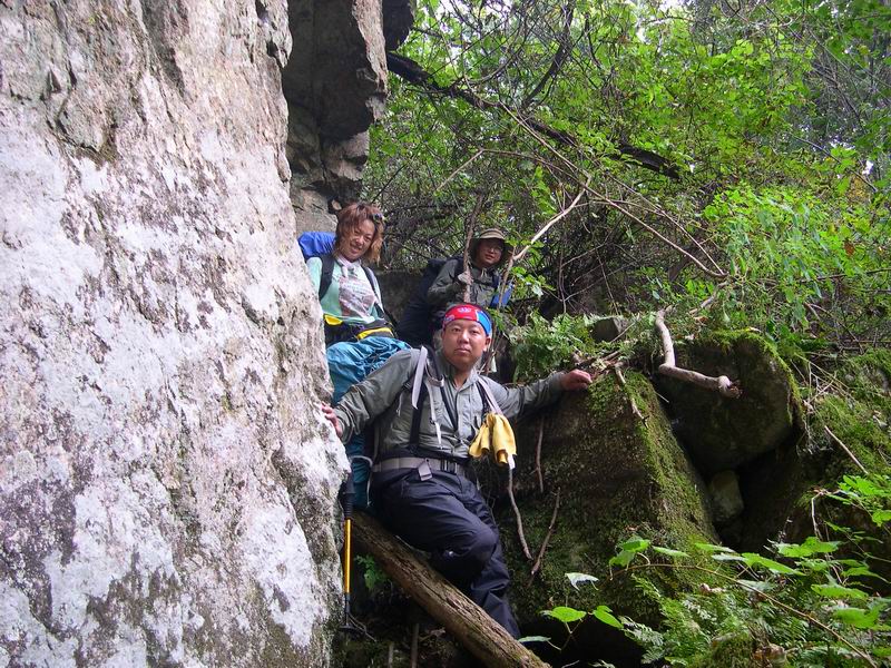 决定下撤后,我收起了双杖,抽出了狗腿。在队伍的前面开路。这样的植被,有把刀还是有些用处的。