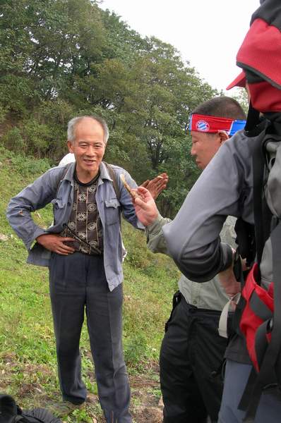拥挤的小车,颠簸的乡间小土路,和我们的说笑声……很快就到了该下车的地方:车子再没有路能开为止!付了车费下车整理装备:该穿上的穿上、该戴上的戴上……我们的奇装异服很快就吸引来了附近的老乡,看我们的眼神还真有那种感觉……谁让我们说自己是驴子呢,自找的。听说我们是要上韭菜顶了山,老乡们一个个地开始惊惊异起来:山上有好多野兽,什么熊呀、野猪呀一群一群的,上山多危险呀;又听说我们还要在山上过夜,一位老大娘更是担忧起来:你们几个小伙子敢在山上过夜,还真是胆大,而这个“十六”的小姑娘也敢在山上过夜吗?真了不起。(咱们的穿越队伍里可没有什么十六岁的小姑娘,真不知道老大娘说的是谁?