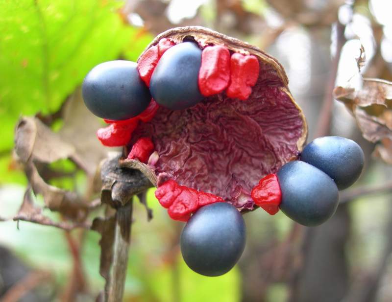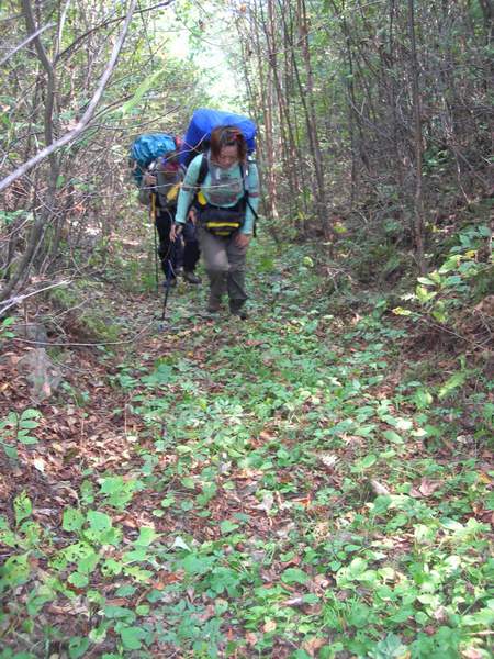 河道只走了一会,就又变成了灌木为主的山坡,此时的山间小路也分辨不出来了,只能靠开路前进。虽然开路的重任落在了石头身上,跟在后面的我也还是时不时地左顾右看,细细辨别着周围异常的东西和声响。先是一小块无草的土地,一看就象是什么动物扒拉过的,那我们相信这可能是野猪干的;还有一次石头走着走着,突然停了下来,并努力地向灌本深处看去,我也开始放轻脚步靠近去,只见树林里一个块黑乎乎的东西,难道那就是传说中韭菜顶子山上的熊!!!