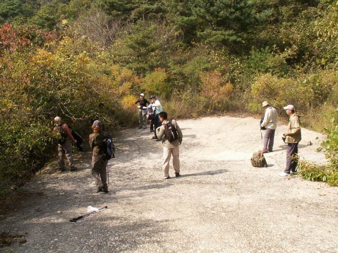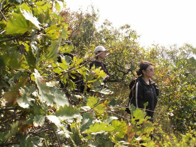 行程:早晨8:20集合完毕,由信用证带路沿北河口南侧的山路上山,在一个小山坡上,建有一个观音台,能看到小平岛的全貌,到山顶后,沿着铁丝网的外围走,有还算明显的山路,在最高的山峰处建有一个火灾观测塔,这是这条线路的标志,过到达这点后可以有多种走法,信用证说可走南部的山脊册(图中的虚线部分),可以走南侧的山沟,也可以走北侧的山脊。我选择了走北侧的山脊,这是信用证没走过的线路,走到山腰处,有一条备战路,(其实已经长满了树,中间只有一条小路可走)。现在回想应该顺着这条路向山上走,我选择了向下走,在山腰处有一块很平坦的柏油路面,我们在此吃午餐,此时为11:40。