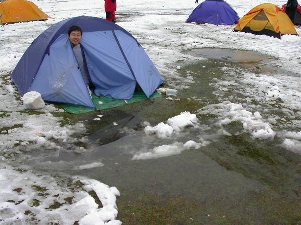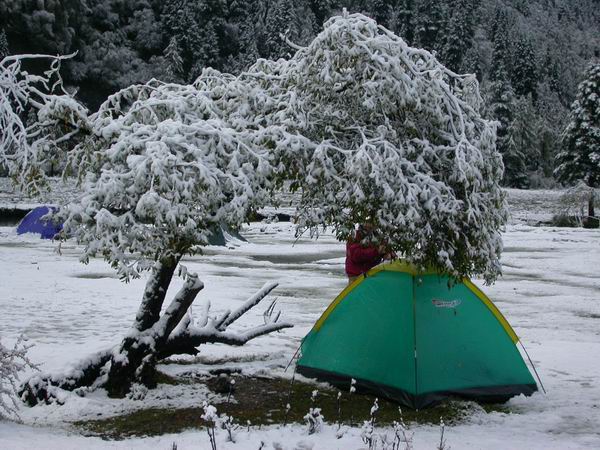 我今年怎么那么倒霉露营不是雨就是雪)也没睡上几个小时,清晨没敢往里再走也不敢负重返回了,其余2个同伴骑马下去,我俩轻装往回走只带了一瓶水,终于走到了枯树滩,BOBO口渴的要命,便去买水.