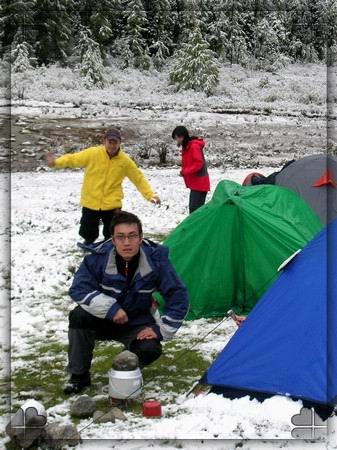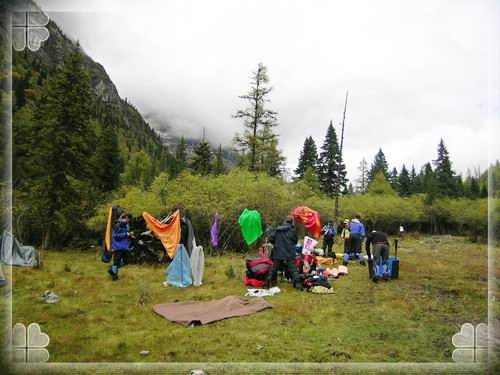 17:40 到达预定的独木桥营地,勉强找了地方扎帐篷宿营。匆匆吃完饭就开始下雨了,下了一夜到早上还淅淅沥沥的。
