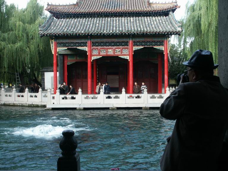 出了趵突泉前行左转,路对面就是五龙潭。比起熙熙攘攘的趵突泉,这里清净了很多。只有一些老人家坐在湖边晒太阳,偶尔见我们这样的一些无所事事的游客,哦,对了,还有很多穿了婚纱的新人们在拍照。济南的新郎新娘们也很幸福,有这么多美丽水。