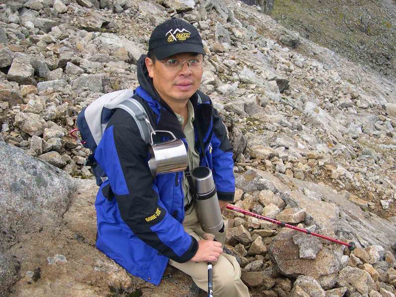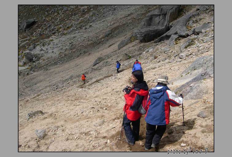 在长坪侧平台休整午餐后,放走了背夫。然后继续我们的行程。到这个时候,所有的紧张气氛都没有了,一路上,大家放松的拍照看景。这张是坡对面的几座山。