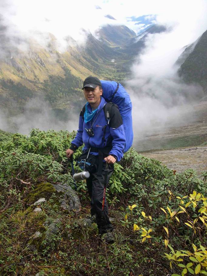 天一亮就出发了,但这个时候,漫山的大雾,让我们没有办法领略更多的沟中美景。有了背夫在前面领路,我们也没有了寻路的负担,剩下的只是调整自己的步伐和呼吸。