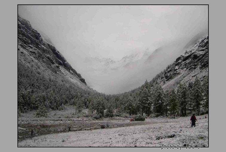 为了让大家感觉到形成的连续,这一张的角度跟上个帖子(2日的垭口翻越)最后一张片子是一个角度。仅仅一夜之隔,大雪盖住了天地间的一切东西。