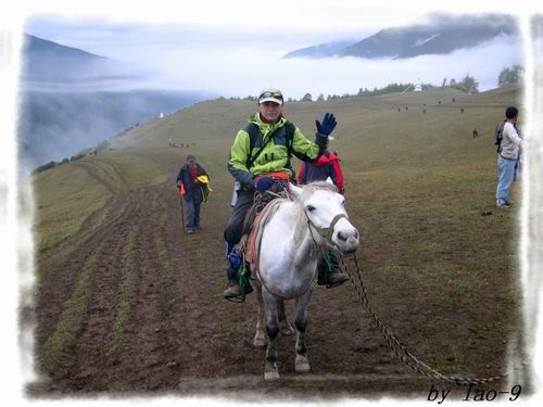 骑在马背上的小凡精神不错,这会正养精蓄锐呢。昨夜nicole的战报让大家很是不敢小视大峰,四位女同学雇了三匹马,准备给大峰的冲刺做足体力上的准备