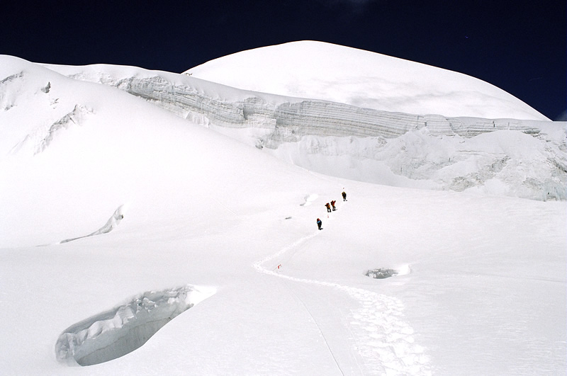 自组队,哪几个大侠修路?俺们当然是协作修路,扎西打头阵,他登顶了珠峰,经验很丰富。今年来了唐峰3次,五一那次修路掉冰裂缝里了,七一遇到雪崩,就我们十一这次没出啥险情。看着路上一道道裂缝,不禁想起仁清屏措老师的话“唐峰是做小山,但是也千万不能小看她……”,6330是做小山,呵呵,差距实在太太太大了