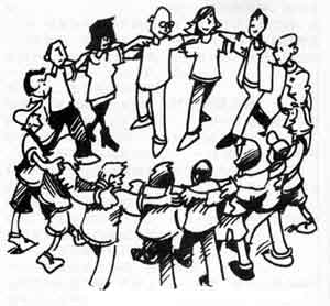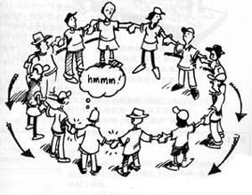 1.让队员们紧密地围成一圈,包括你自己。 2.让每个队员把自己的胳膊搭在相邻同伴的肩膀上。如主图所示。 3.告诉大家我们将要面临一项非常艰巨的任务。这项任务是大家要一起向着圆心迈3大步,同时要保持大家已经围好的圆圈不被破坏。 4.等大家都搞清楚了游戏要求之后,让大家一起开始迈第一步。迈完第一步后,给大家一些鼓励和表扬。 5.现在开始迈第二步。第二步迈完之后,你可能就不必挖空心思去想那些表扬与鼓励的词语了,因为,目前的处境已经使大家忍俊不禁了。 6.迈第三步,其结果可能是圆圈断开,很多队员摔倒在地。尽管很难成功地完成任务,但是这项活动会使大家开怀大笑,烦恼尽消。 |