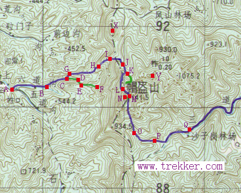 14:20,走到P点,午餐,简单吃了两口。再背包前行,不久遇到较宽些的山路(图中虚线部分),Q点附近遇到一房子,一人一狗,听农家老大哥说顺路东行4公里可到沙子岗村。下面的山路就可以跑车了,相对平坦好走得多了。