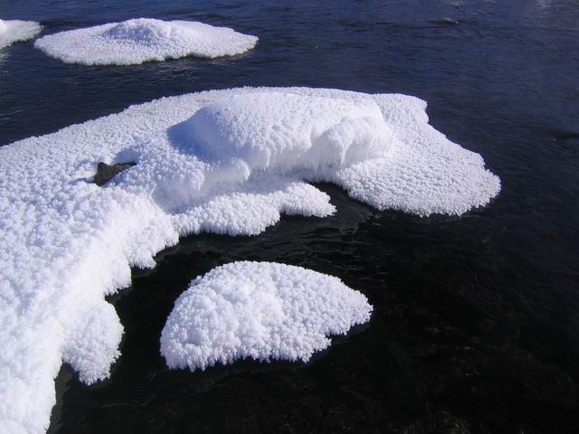 一棵棵的雪蘑菇群,雪毯上好几种大小各异动物足迹奔向山林深处..领队拍完照片就和他们回去了,我和笑凡,舍得,二郎四人觅着足迹走进更深的地方,那里面的足足盖过我的膝盖,我半跪着,爬开上面薄薄的一层用舌尖轻轻卷了一口,入口即化,很凉爽,舒服极了!然后用手不断扬起雪,飘飘洒洒的在光下七彩灿烂,银光闪闪 !感觉手中扬得不仅雪,而是扬起的一份心情,跟着雪一起飘落融化!想着这林子里的小动物该是多么自由快乐,冻有白雪相伴,夏有流水相戏!如此自由生活夫复何求!"喂"的一声音把我从遐想中拉回现实,车那边有人在催我们四个,二朗说就不着急这么美多停留,多发现,舍得收到不少的美景在相机里.我们才慢慢的退出了这片纯净的世界,离开了石塘布道,回到车上已经一点了,该吃中午饭了,从原路返回!这条路和其他路不一样的:只有3米宽,为什么?就因为这路以前是小铁路,专门运输木材的,现在铁轨拔了改成小公路,跟着这路的旁边还有一条哈拉哈呵(是蒙语)是水到运输的,这条还是国际河流呢流外蒙古国的,你可别想象有多大啊,不能用船的,是砍伐的木材直接仍河里顺流而下的,是直接的"水运"!好玩吧