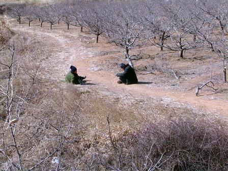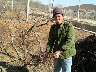 路遇一个修剪桃树的村民,叼着烟尾巴,幸福满足的样子,很好的景象。于是提出要给他照个像,他很高兴,慌忙的将烟头丢掉。我说抽着烟照相更帅,于是他弯腰要捡脚底下的烟头,但是烟头已经被踩扁了。就在捡烟的手离烟头还有