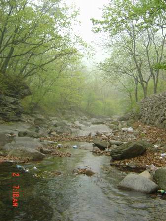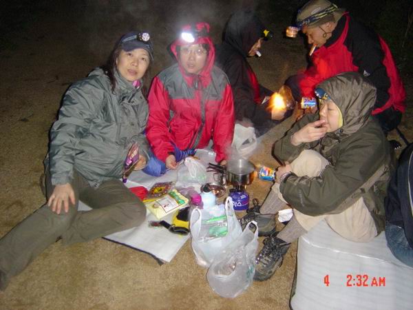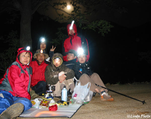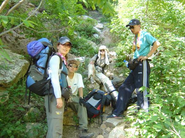 就这样一个黑乎乎,伸手不见五指的夜里,我们在乱石丛中开始了爬山了。没有走传统的盘山路,领队给我们选了一条乱石路,脚下还有流水。当时大家的装备也不是很好,好像当时穿了登山鞋的两个MM都光荣落水了。中途ZY因为脚磨了无数个泡,一个人光荣下撤了。也从此让俺真正地认识了ZY同志,稍后给他做个专辑~~~