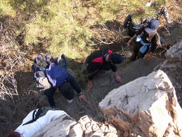 老九走后,剩下了十一个人,在虎滩新区的一个街心广场上我们简单的吃了午餐,大约13:00,我们找了个最高的山头爬了上去,也许没有找到合适的上山路线,上山的时候挺困难,到了山顶就看见明显的小路了。顺着小路我们一直向前,大约16:00走到山屏街,出口位于山屏街桥东侧的人字形的公路处。其实这条线路是我一直想走没机会走的一个路线,山屏街-石槽线路,我个人觉得这是个经典线路,特点是:山都不是很高,山上足迹明显,山体相连无隔断,山上植被很好,因为近社区,山上各个方向的路很多,是锻炼头驴方向感和判断力的好线路。