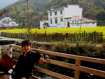 公路沿着不大的山丘蜿蜒而去,右手边的山丘种着一团团茶树,左手边是一条河,越走河越宽敞,不久就变成一大汪,当地人叫月亮弯。一开始稀落的油菜花在月亮弯连成了一线、一片,白墙黑瓦的著名徽州民房错落其间。我们不由得哇呀大叫,摩托车司机吓得一刹车,啉哒端着枪(长筒相机),我举着迷你炸药包(DV),奋不顾身跳下摩托冲到公路边,开始抢掠风景。