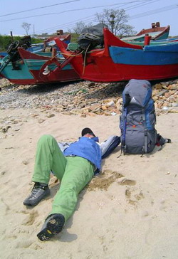 风还是在刮,虽然有太阳,还是很冷。中午拔营去参观老铁山灯塔,看了上次没有看到的张健的大脚印还有桦树皮说的姻缘墙。还有一些时间,于是又到宁静的陈家海边转了转。海水很清澈,港口很宁静。躺在细细的沙滩上,晒着太阳,很温暖,终于有了那么一点点春的感觉。