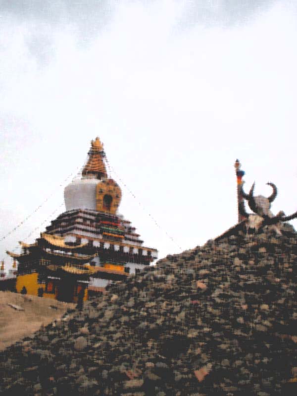 风雪依然,随风飘起的经幡更加的遒劲,无数经幡在风雪中飘摇汇合成美丽的经幡塔。红的,蓝的,白的,印满经文。瑰丽的牛头骨,祭放在玛尼堆上,印满经文的石片,深邃而悠远。寺庙,白塔,转经,不同的教派,不同的人,却有着同样的虔诚与满足。