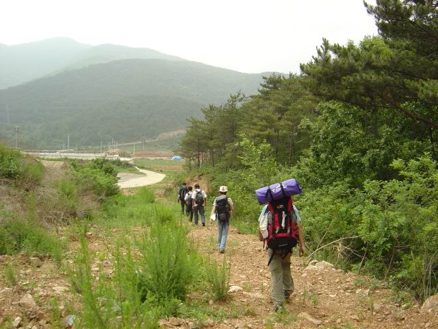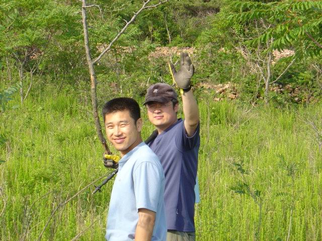第二天一大早,ZY很厉害的,拿着指南针很认真的带路,领着我们顺着果园向右转再向右转,最终又转回了水库上游~更厉害的是,听到公路上的汽车声竟然告诉大家马上就到旅顺南路了——当时刚出发半个多小时~~