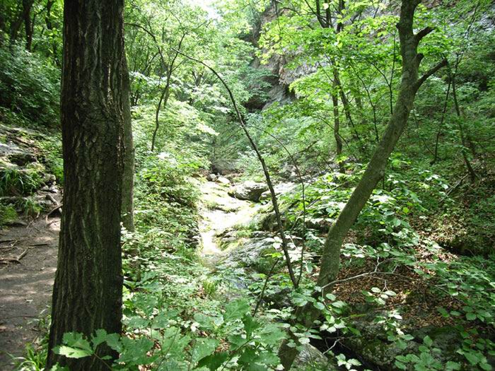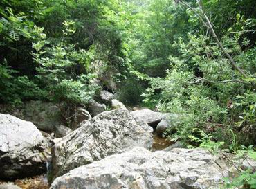 包车来到孙家窝棚下沟圣水寺下院与司机定好四点半准时来接。在向上院走正被太阳烤得不行的时候,走在最前边的我忽然感觉眼前一亮,哇~~迎面走来一美女,说她是美女可不是我在山里见不着人标准低啊!!就那质量在城里见着了回头率也绝对百分百,那就叫一个白啊!!上穿坎袖上衣,下穿及膝短裙。魂魂这时也来了精神,大叫变换队形,本来右侧通行的我们变到左侧通行,就在这时大美女做了个令人销魂的动作,轻轻地弯下腰向下拉了拉短裙(不在现场是无法理解那种销魂蚀骨感觉地!!)靠~~我们很匪吗?美好的时光总短暂的,她后边跟上要不是三个壮汉就完美了!与龙潭寺相比圣水寺开发的很好,寺庙建设一定的规模,香客也不不少,路上遇见那三男二女就是来圣水寺上香的。到了圣水寺上院刚刚坐下,就从斋堂里冲一胖女人很不客气:“你们干嘛地?旅游的吧,小点声啊,师夫们都睡觉呢。”这种地方多待无益,走人上山。在半山腰找了个有水背阴的地方开始造午饭了,饱暖思淫,吃饱喝足后三人自然是对路上那美女一通意淫××××(作者此处删去二百字)。要上山出发,魂魂提出他不上去在原地看包,给他留下对讲机后岩羊与我便上山了,去找传说中的水帘洞。万福山区的植被都非常的好,圣水寺后山上都松树林遮天蔽日的,上山的小路十分清晰四十分钟左右就上到了山顶了,我们又向下走了一点,路挺险的就在悬崖上,转了过去对讲机就没有信号了,拍了几张片子后就回去了。下山到圣水寺上院,遇见了不少香客,还有两村姑级美女,走在前边的我急忙用对讲告诉后边的岩羊和魂魂,二个飞下山来看了后总结:虽不及上山见的那个,但好歹也是个女的啊!!将就看吧!圣水寺的条件很好有机井把水抽上来并安了水龙头以方便洗漱,我们自然不能放过这机会,在我和魂魂洗脸的时候两村姑级美女走了过来站在我们身后注视着我和魂魂,顿时我心潮澎湃,哪还能有心意洗脸啊,该不会是遇见女贼了吧,这脸不要,起身回头盯着两村姑级美女看,两人走到水龙头前一个要洗腿,靠~~不会吧,难道在挑逗我和魂魂?这种级别的艳遇我需要吗,我得好好想想啊!自做多情中......呵呵,原来是腿破了啊,岩羊走了过来:“腿破了啊,呼噜你不是有消毒巾吗,快给拿点”,姜还是老的辣啊,就这么让他送了个空头人情。擦完走人了,岩羊说要刮胡子!?让我去给他借个镜子@#%%¥&我疯了......