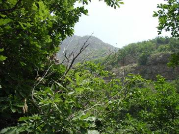 都说上山容易下山难,我到是没有觉得,下山多了几分轻松,没想一放松不要紧,又走错了路。上山中有一段没有路我们顺着树棵一直向上冲就过去了,可下山就麻烦了,到这段看不出来上来的路了,不能顺着来时的路回去,找不着包就坏了,东西可全在里边呢!!看了一下后决定向左即东边切过去,往下走一段后还是没看着放包的那片石头,当即决定下到底再顺上山的路上去找包,这一切多走了不少冤枉路也浪费了时间及体力!这时大家都有点急了也累了,路上除了研究路线外没有了说笑,空气紧张了许多。我在想如果天黑了的话幸好我还带了头灯,不过估计三个一个灯起不了什么做用的。下到沟底小路向西走又到了龙潭寺,找到了原来上山的路立即上山找包,还好放包的地方离山脚比较近来回二十分钟就又回到了龙潭寺。呵呵~~这会大家知道我为什么在序言里说这次是拉磨了吧,磨盘就是龙潭寺三头驴就围着龙潭寺转开了!!不怕大家笑话我们,两天前后总共六次到龙潭寺,与龙潭寺特别的有缘份,第二天我还有奇遇呢。在寺门口三人休息吃了点东西和寺里的老师太聊了一会儿。辞别老师太向玉石水库方向出发,此时已接近五点半了,这时我们盘算着得抓紧时间赶路了,否则很难到达玉石水库营地,白天二次走错路当误了太多的时间。到达垭口时太阳正要落山,金色的阳光正好照到水库边上二座植被不是很好的山上,有点日照金山的味道,只是由于我经验不足及相机有限,并没有拍出感觉!!
