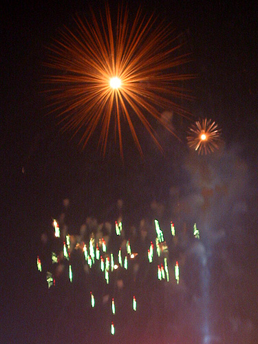 别说焰火,拍夜景都不能用闪光灯的。所以需要把相机固定,采用慢速度才拍得出效果。