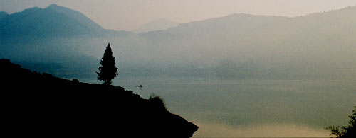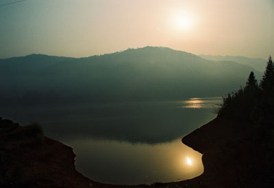 “清晨的雾霭还未消散,静静的水面映着山的倒影……”呵呵,还有太阳的倒影