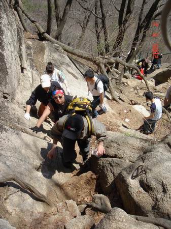 终于和大部队会合了,我们陆陆续续听到的更多的细节。知道了奔跑和幽梦影是如何坐在小卖店里吃着热乎的方便面看着飞鸟和其他TX孤苦的站在大门口,也知道了飞鸟如何在悲愤中买醉,还知道了有的TX如何试图逃窜却再次被抓。一路的欢声笑语中,我们向向往已久的老牛背爬去。路上游人很多,山路虽然不是很好走,但没有预想中那么危险。虽说今天是假日,可太阳公公并没有休息,赶走满天的云彩,普照四方,我们成了他老人家的岩烧肉,时间似乎过得很慢,我们在光秃秃的岩石上汗流浃背。好在我们在半路上买了几瓶冻成了冰块的水,macaulay率先砸冰大嚼,一时间众人纷纷效仿,我第一次知道冰块也这么可口。