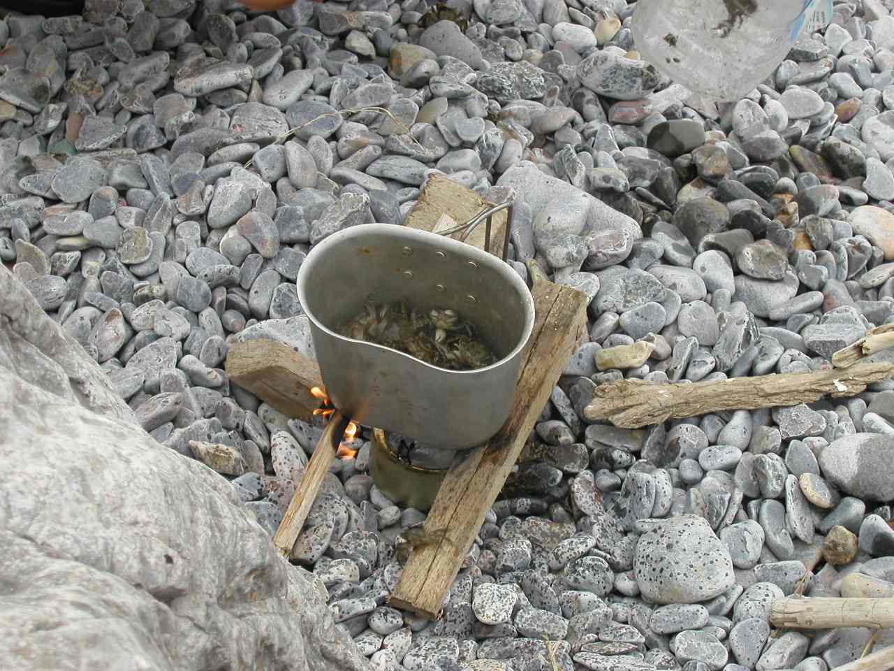 准备生火做饭,左边的矿泉水瓶子里是我俩抓的螃蟹,一会就变成油炒螃蟹了