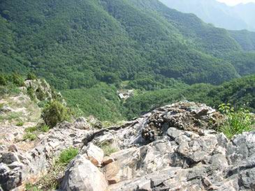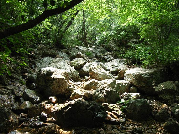 这时老师太与几位居士也安慰让我不要过意不去,没有事。但这事现在想起来我还是感觉特过意不去,这里友情提示各们看官,以后可要小心不要像我这样冒失啊!!过了一会儿那位问我话的居士出来叫岩羊,说师夫要见见他。看来岩羊的佛缘比我深啊,我是硬闯他是被招见的,比我层次高啊。岩羊进去了一会儿出来后,慧圆师夫也给他写了几句话让居士带出来给他,写的什么当时看过,现在忘了。后与师太谈起闭观的事,师太说与她同住的居士小刘去年闭谷不吃不喝了四五十天(具体多少记不清了)呢,真是太神了!!收拾完东西我们决定再上到垭口看看能否穿到水库那边去,老师太说她走过那路,送我们上山为我们指路。延着昨晚上山的路再次上山,老师太体力挺好的,一路上没有休息。到达垭口时遇见了爷三个,经交谈得知三人是从水库那边的村子过来挖人参的,水库的船坏了,他们是划着用汽车内胎自制的小船过来的,我们是不可能联系到水库的船到水库那边的村子的,从山上走太远了得走一天吧。好吧,只能原路返回原计划从水库穿过去到步云山是不可能了,下山后时间够用的话就去孙家窝棚踩线去。我又在垭口拍了几张水库的片子,就开始吃饭了。下山第六次到龙潭寺,这次没做停留和师夫打了招呼后就急忙下山去了,好在昨天上山是走水路上来的,今天下山走的旱路和昨天没有多少重复的,但一路上的风景实在没法和水路相比了,一路也就没拍片。两天来没有怎么被太阳晒着的我们,猛的被太阳这么一晒都受不了,表现最强烈的就是我,最大的愿望就想喝口冰的百事可乐,一路嘟嘟囔囔:下山第一件事就是买瓶可乐喝,放~魂这时也开始有意挑逗我,给我讲:拿起一瓶冰得的瓶上粘满着水珠的百事可乐喝一口,可乐咕噜滑过喉咙......想想都要疯了,一瓶冰百事可乐就是我全部的愿望......就这样在半疯中我们下了山,看到了山门我健步如飞地奔了过去,还不知残酷的事实在等着我,除了山区小厂出的那种劣质饮料外没有其他任何饮料......还好我比较抗造,没有被残这酷的事实击倒。为了我的愿望,为了那口冰的百事可乐我们继续前行。进村子找到了唯一的小卖店再次令我失望。