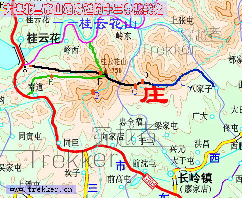这次活动计划的是桂云花-----牛心顶----欢喜岭穿越,最后实际走的路线为桂云花----庙沟后山----八家岭穿越。一队总共行程约15公里,第一天用时约9小时,第二天,一队用时约3小时。