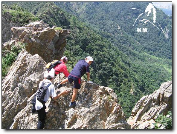 8月20日,我们一行4人(其中最小的那个是我的儿子,13岁)从大黑山东侧类似奔儿头的山脚下开始登山,60多度的山坡从9.30分开始爬到山顶时已经11.30分.休整补充能量后,开始穿越"刀背".在穿越"刀背"后继续行进的下一个山峰处,遇到欢声笑语的一只队伍,看样子是要在山上宿营.一打听,原来是"穿越者".哈哈,大鱼做了自我介绍,我也报了自己在"穿越者论坛"注册的网名,虽然没有参加过"穿越者"的活动,但也算是在论坛上经常拍拍砖了,并不陌生.希望有机会一起进行穿越.