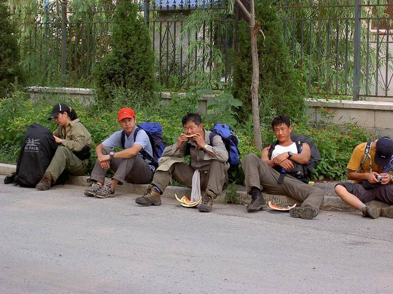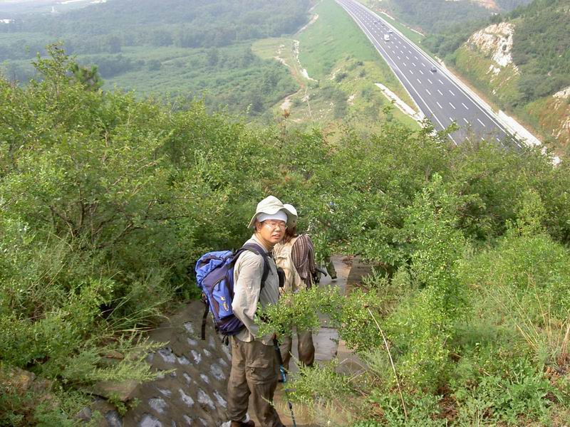 2005年8月27日早乘7:25分大连-普兰店的大客车,9:00在九里山坡上的加油站下车,顺着加油站下方的民房东侧的机耕路上山进入一片桃园,没走多远,便可发现一条通往微波中转站的一条柏油路,(估计这条路也能通黑大线上)到达中转站后继续向西走,没什么明显的路,一直可以走的高速路最悬崖上,顺着排水沟下到高速公路上,可能是因为这里是高速公路最大的一个坡路,因此在车流的空隙穿越高速没给大家带来多少危险。