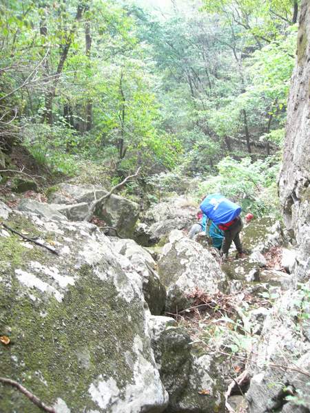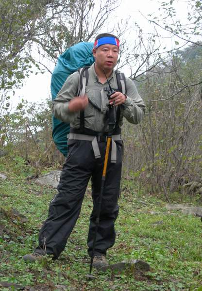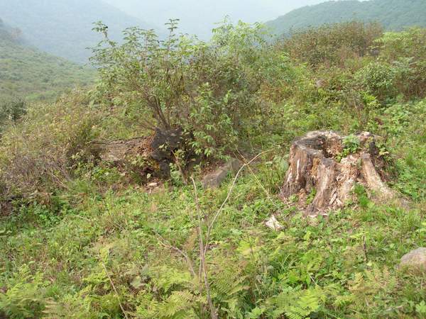 河道只走了一会,就又变成了灌木为主的山坡,此时的山间小路也分辨不出来了,只能靠开路前进。虽然开路的重任落在了石头身上,跟在后面的我也还是时不时地左顾右看,细细辨别着周围异常的东西和声响。先是一小块无草的土地,一看就象是什么动物扒拉过的,那我们相信这可能是野猪干的;还有一次石头走着走着,突然停了下来,并努力地向灌本深处看去,我也开始放轻脚步靠近去,只见树林里一个块黑乎乎的东西,难道那就是传说中韭菜顶子山上的熊!!!