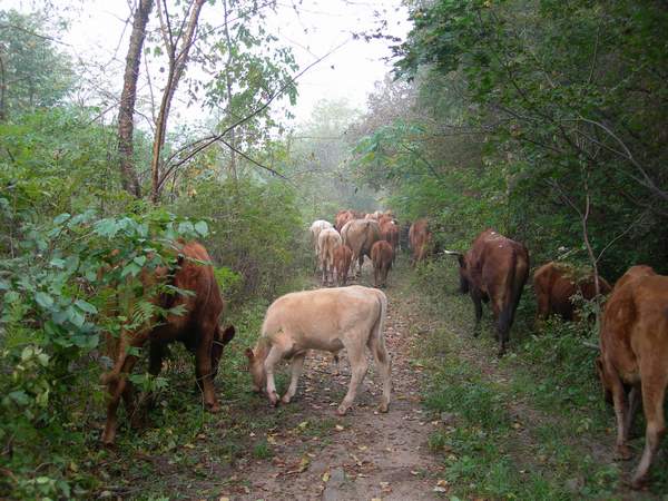 进山的机耕路好象要一直延伸到山顶上,车轮的印迹也很明显,看来是经常有走车的,走在上面心里也能踏实一点,毕竟经常有人的地方,野兽会躲得远一些。走机耕路还是很省力的,可是还没等爬升多大的高度,机耕路就被山间的洪水冲得无影无踪了,就剩下一块块岩石铺成的河道。