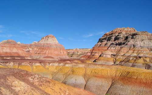 五彩城位于古尔班通古特沙漠的腹地,系由深红、黄、橙、绿、青灰、灰绿、灰黑、灰白等多种色彩鲜艳的泥、页岩互层构成的低丘群。五彩城随着一天中太阳光线和昼夜的变化,其色彩和情调也随之变化,充满诗情画意。这里是钟情于斑斓颜色摄影创作者的大好拍摄地。