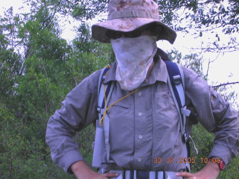 38点在一个海拔152米的山顶上,坡度相对比较缓,找点位自然是不难,在山坡上的一个弹坑里,有ALIAN和ZIZHAN在,什么都不必操心,跟着走就是了。可是一个不小心,沿途macaulay又第二次崴了脚,同样的部位,应该是非常非常疼的,半天才缓过来,看得真揪心,可是大麦很坚强,上了点儿药之后,硬是要跟大家一起走,不让叫救援,磕了,不知道大麦怎么忍过来的。我们的跛脚伙伴一路上居然捡到了ZIZHAN的胶卷盒和我的太阳镜,真佩服死了。