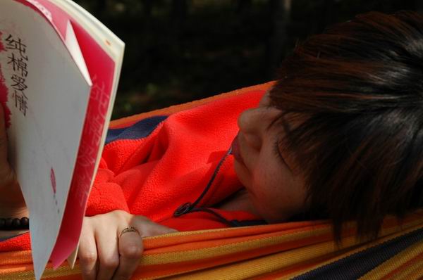 两个人都在看一本书叫<纯棉爱情>,看样子要把爱情进行到底