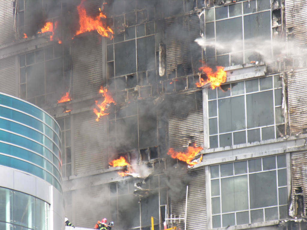 出来时看见整个大楼的上半部分都被烧得面目全非了,不过当时火己经熄灭了。