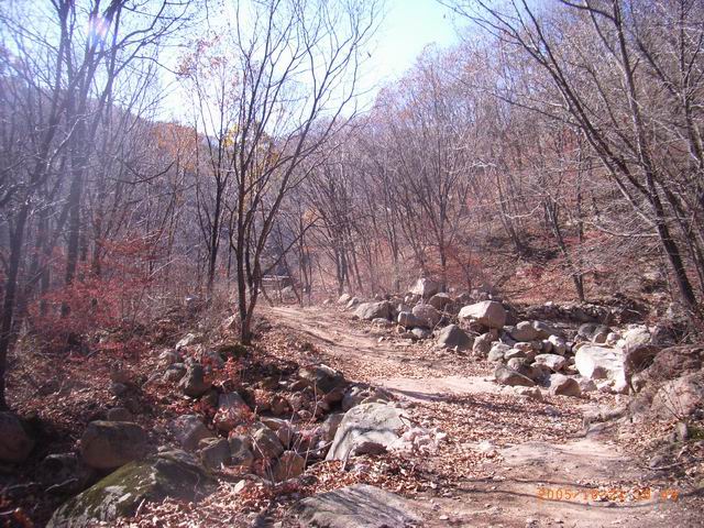 向南侧山脊走,发现了很宽的路通往主峰,西侧的大山体滑坡造成的石砬子(应该是入山时右转的登山路线末段)